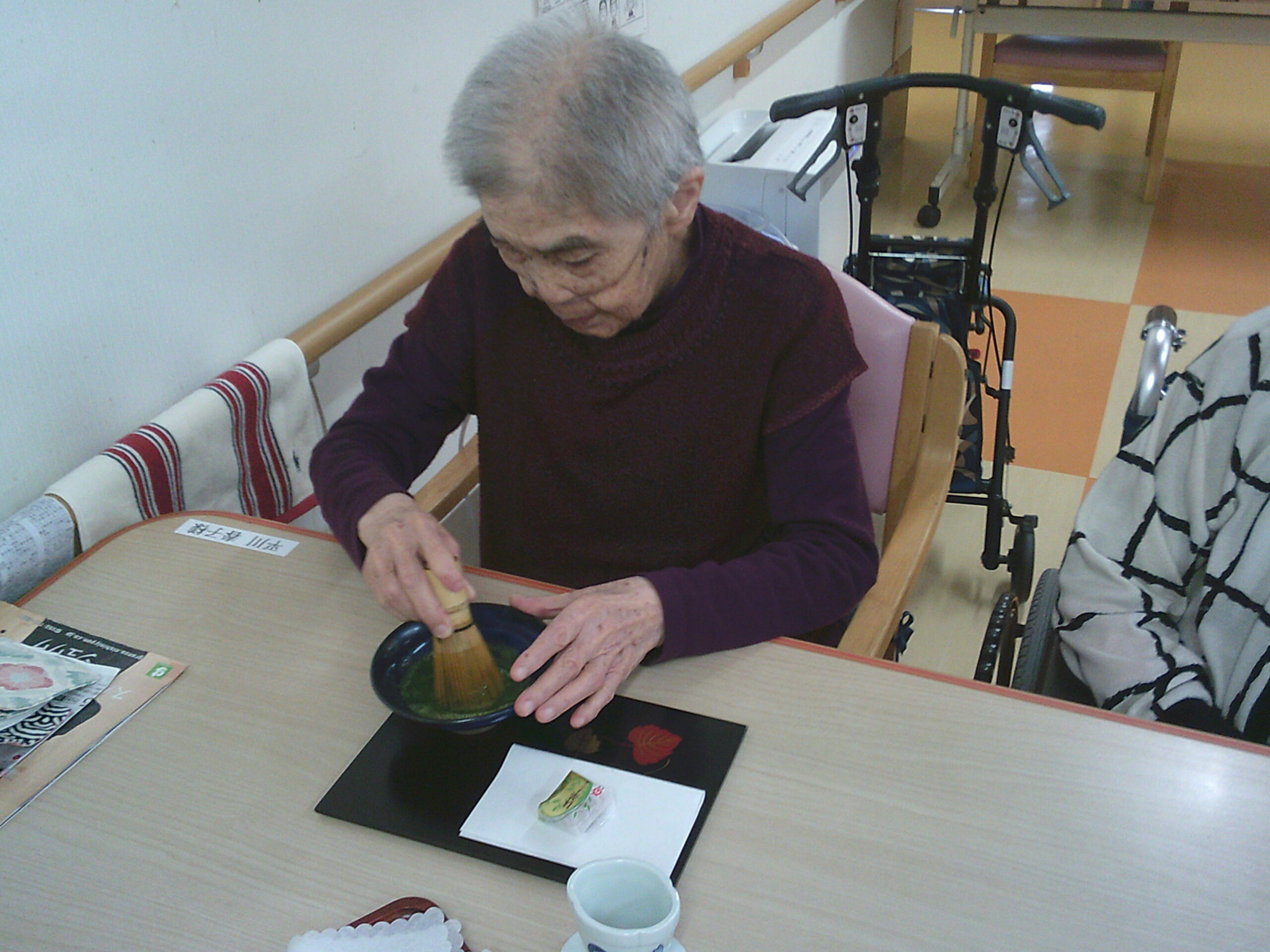 さわやか花美弐番館 さわやか花美館 趣味の会 2025-11-16 2025-11-13 今回の趣味の会は抹茶を点ててのお茶会です!! Digital Camera 茶菓子も一緒にどうぞ おいしいと評判が良かったです こちらは自分で挑戦してみました ただ混ぜるだけと思いきや あわ?.。o○がたつように混ぜるとのこと おいしくいただきました!!