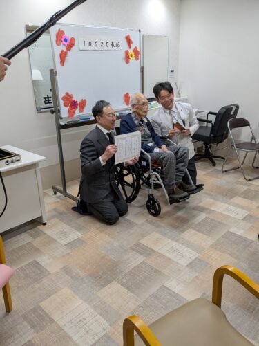 毎朝9時から約30分ほどかけて入居者様に元気にそして前向きに一日を生活していただくために活力朝礼という取り組みを行っております。朝から『明るく元気よく』をテーマにラジオ体操から始まり声出しをします。身体が温まったら次に簡単な計算問題はじめ漢字クイズなど認知症の予防や脳を活性化させるような取り組みを実施し、その後は入居者様お待ちかねの職員が工夫を凝らしたレクリエーション♪