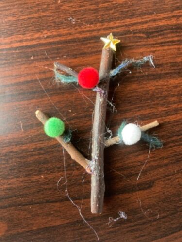 三角形に組み合わせた木の枝に、毛糸を巻きつけて飾り付け、サンタの帽子やツリーを作っています。