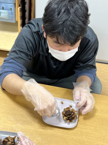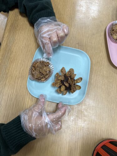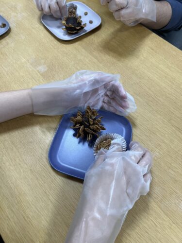 おやつレクで「マシュマロまつぼっくり」をつくりました😽