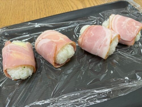 俵型になったら、上にスライスチーズを乗せ、ベーコンで巻きます🥓