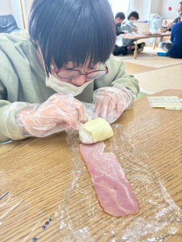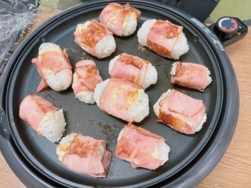 昼食レクで肉巻きおにぎりを作りました🍙