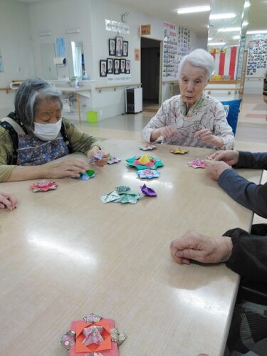 各階から折り紙好きの入居者様をお誘いして、折り紙3枚をそれぞれの形に折りコマづくりをしました。