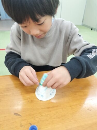 円錐にした紙皿に毛糸🧶をのりで貼り付けながら巻きます