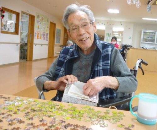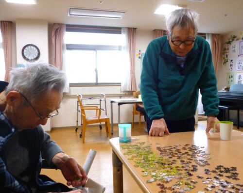 お茶の時間パズルのピースを広げて集中される入居者様のお姿が🧩💕