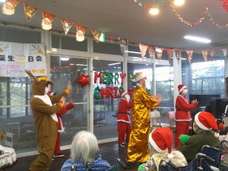 続いては職員の出し物です。曲に合わせて体操ダンスです♪まずは赤サンタがお手本をしてくれました🎅✨続いて金サンタとトナカイ登場、本番です。