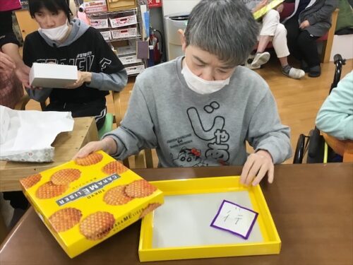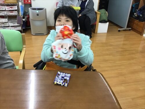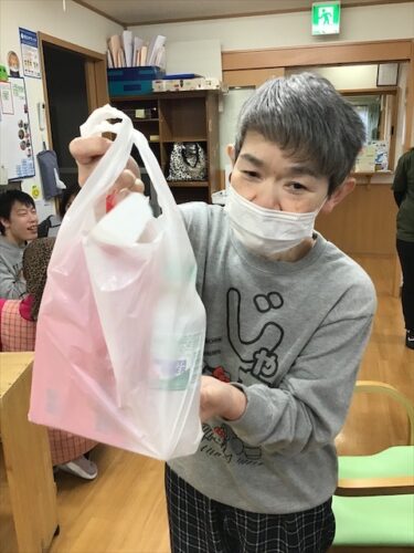 ビンゴになられた方からプレゼント🎁をもらい嬉しそうな利用者様😊