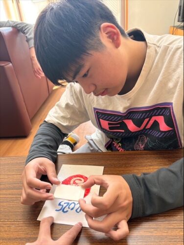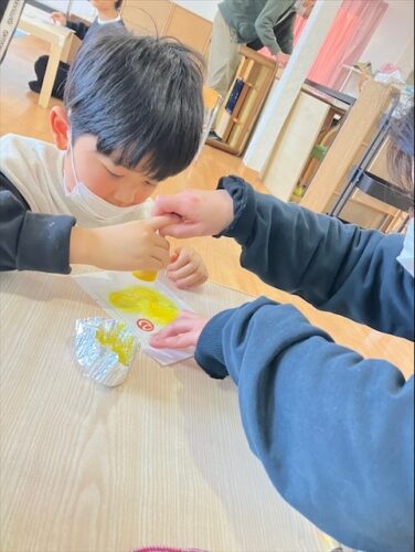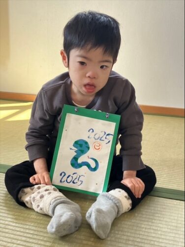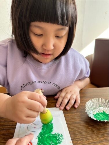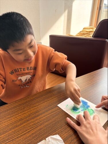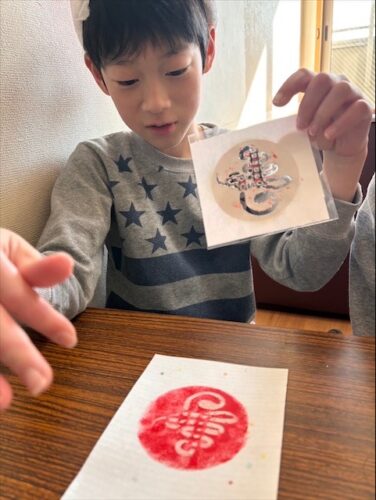 スポンジや消しゴムスタンプを上手に使い、好きな色を選び思い思いのお正月飾りを作成しました✨