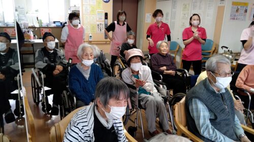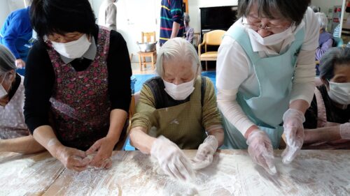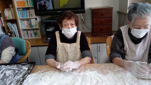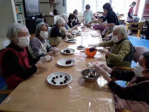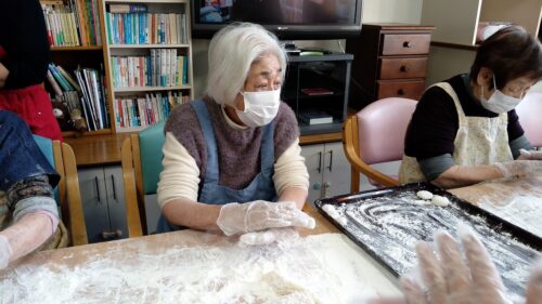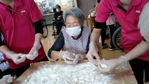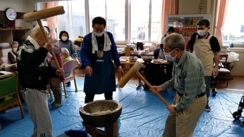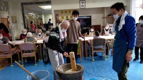 本日はもちつきを行いました。入居者様にお餅を丸めて頂き、また、男性の方は杵で餅をついて頂きました。みんなで「よいしょー!」と声かけしながら、楽しくもちつきが行われました。