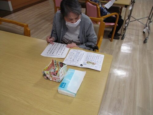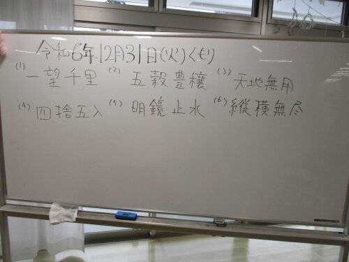 さわやか室蘭弐番館 3階 31日活力朝礼♪ 2025-01-01 2024-12-31 皆様こんにちは♪ 昨日の様子をお届けします 2024年大晦日です ラジオ体操スタート 頭の体操はプリント問題です 四字熟語を探します 素敵な一日になります様に☆