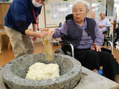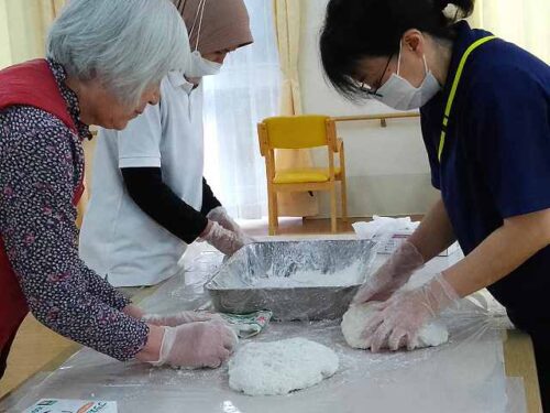 つき終わったお餅はご入居者様にもお手伝いをして頂き、形を整えました。