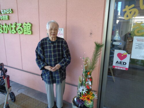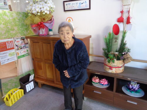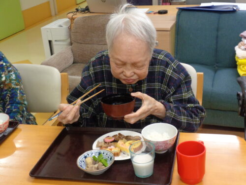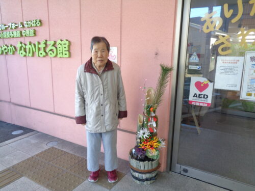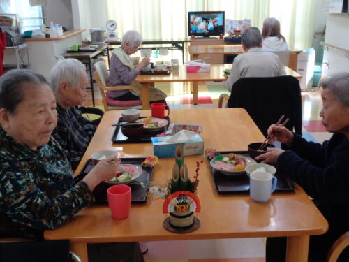 元旦朝の食事の様子と施設の玄関でそれぞれのスナップショットです。
