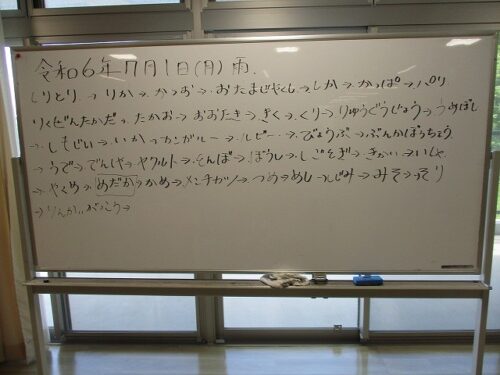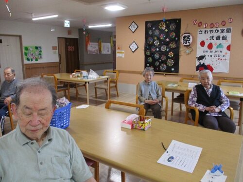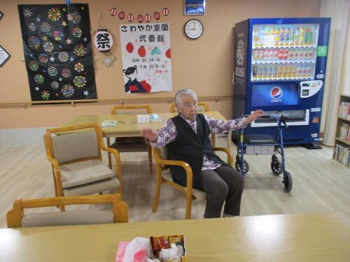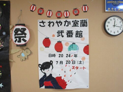 さわやか室蘭弐番館 3階 7月1日活力朝礼 2024-07-05 2024-07-05 皆様こんにちは 更新が遅くなりました 1日の様子をお届けします 9時からラジオ体操です! 頭の体操はしりとりです 7月は雨のスタートとなりました 7月20日は夏祭りです 職員が準備したポスターを 食堂に飾りました