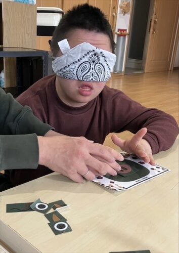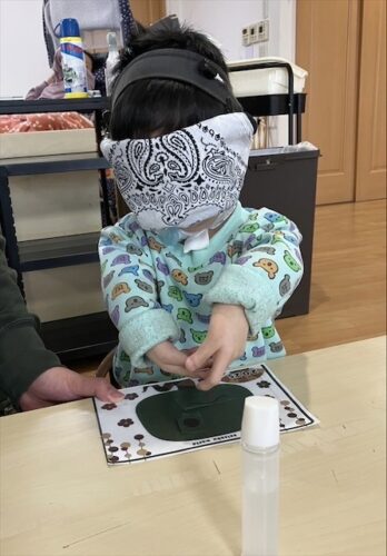 目隠しをしてできる児童は職員の声を聞き、手の感覚で場所を決めて仕上げました!