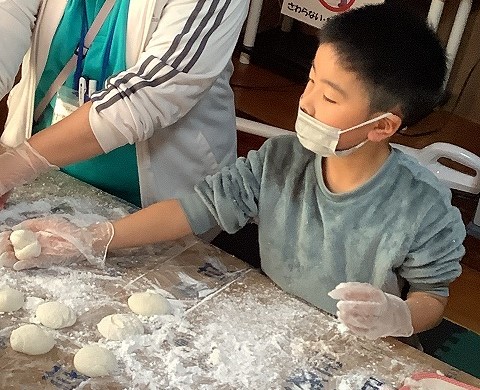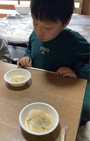 一生懸命にお餅を丸めていった後には、自分たちで丸めたお餅を食べました。