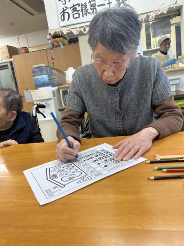 ある日の出来事です、、、フロアでご入居者様にカレンダーに塗り絵をして
