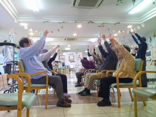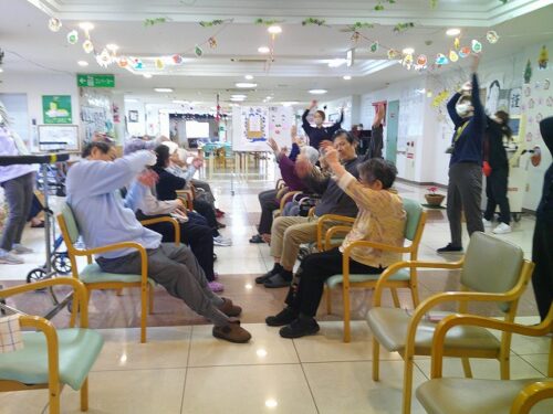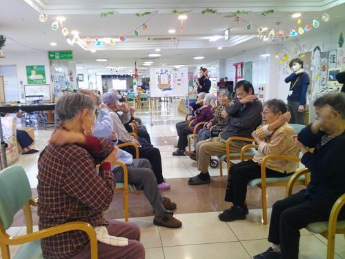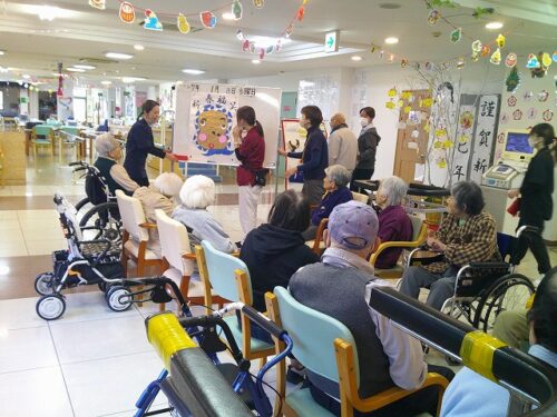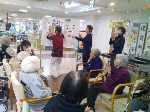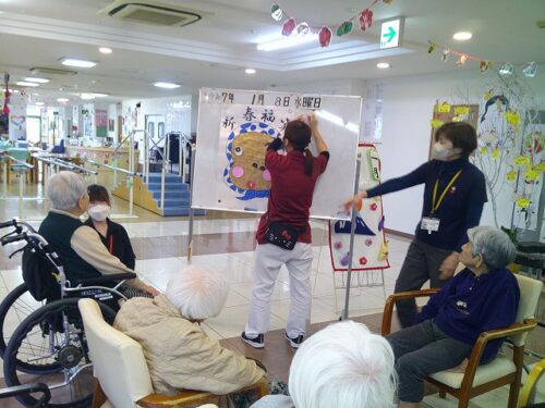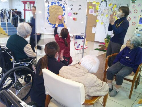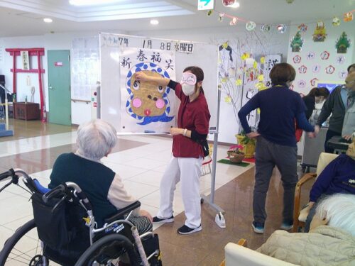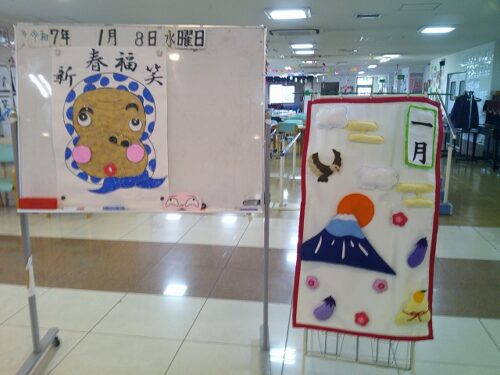 今日の「福笑い」と職員手作りのタペストリーです✨