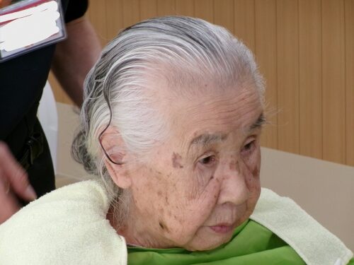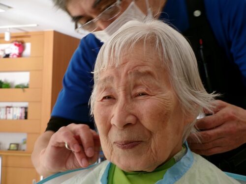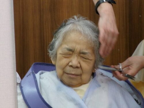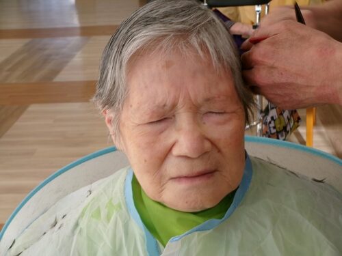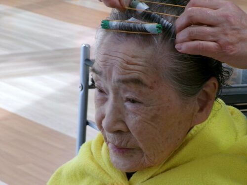 パーマの施術を受けられる入居者様