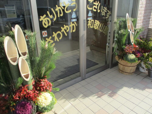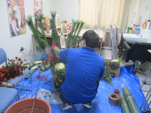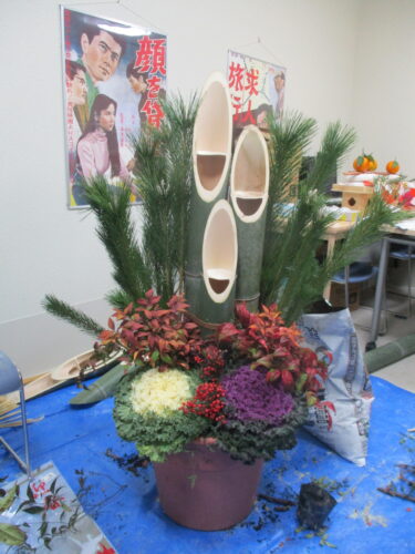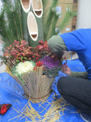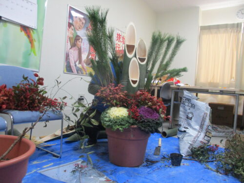竹が切れたら容器に土を入れ、葉牡丹を植えて若松の枝、