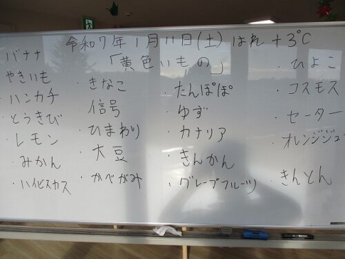 さわやか室蘭弐番館 3階 11日活力朝礼♪ 2025-01-12 2025-01-11 皆様こんにちは♪ 昨日の様子をお届けします 3連休の初日は 穏やかな天候に恵まれました🌤 頭の体操は黄色い物お答え頂きました🌻 楽しい一日になります様に☆