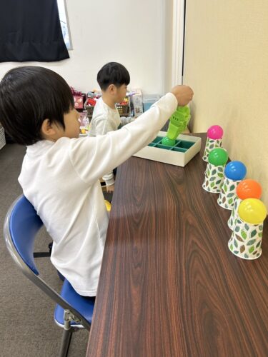 カラーボール運びゲームを行なっています。