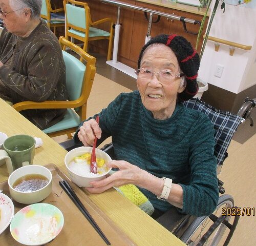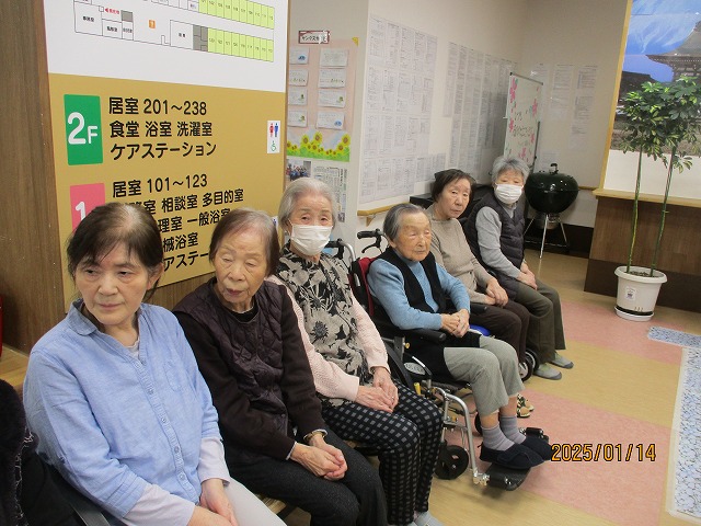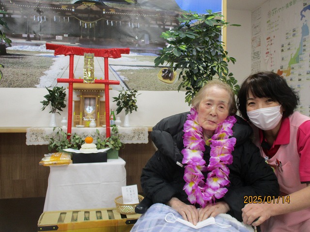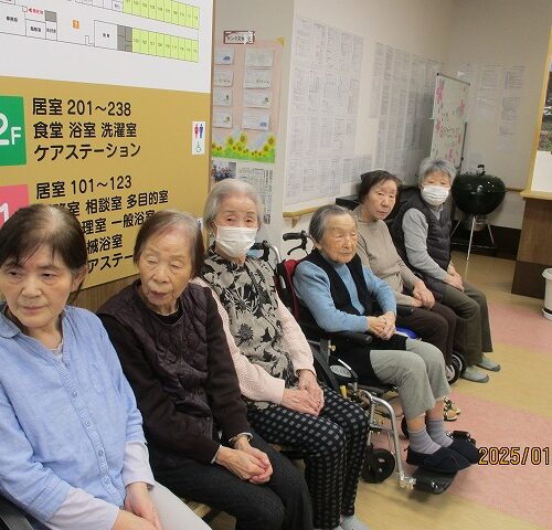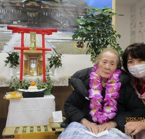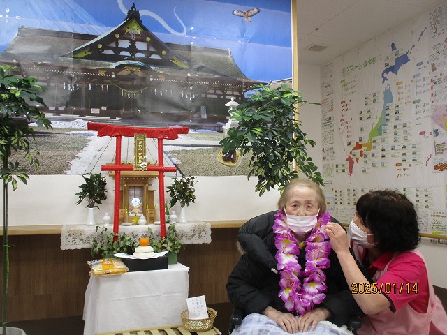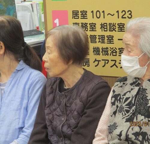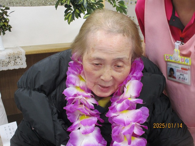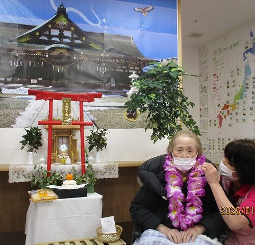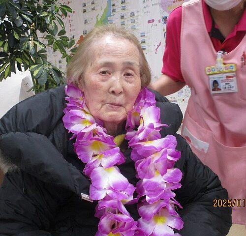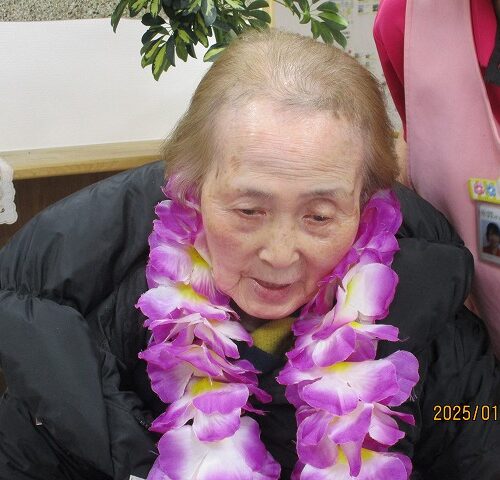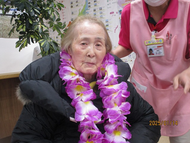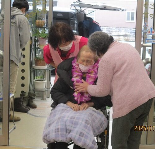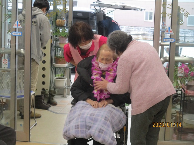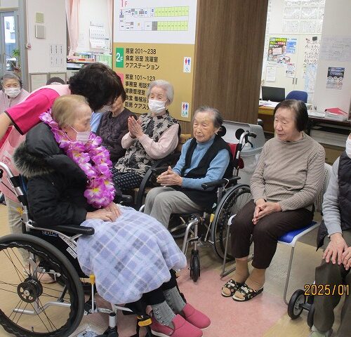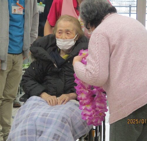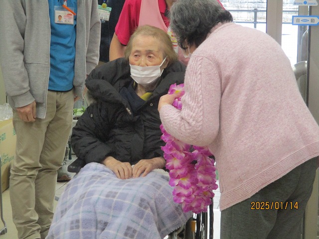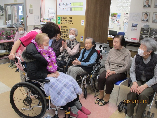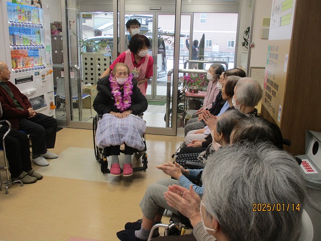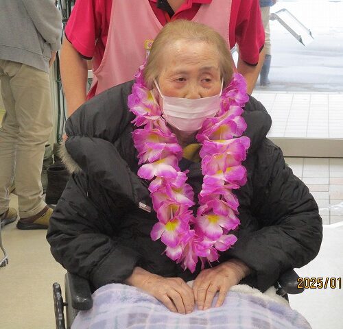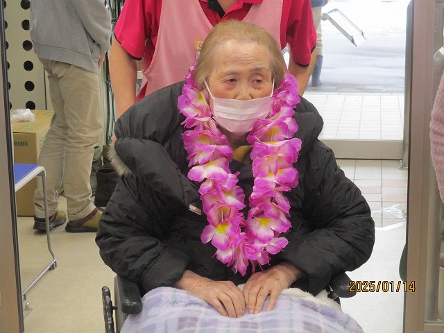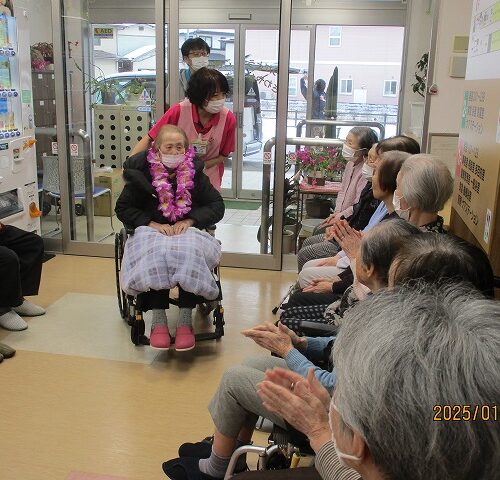 拍手とお花の首飾りでお出迎えを致しました🌼入居者の皆様も『よろしく~(^O^)』と声を掛けておられましたよ☆
