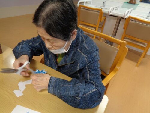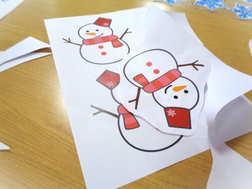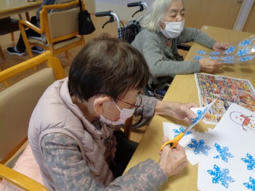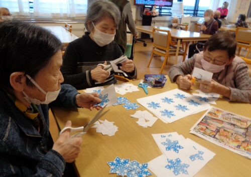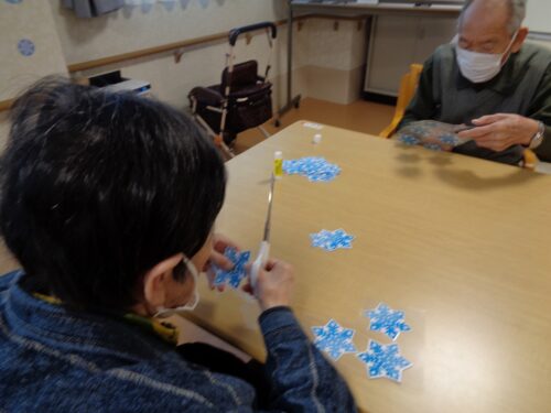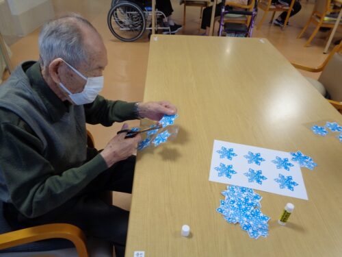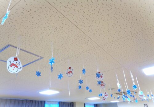 雪が降りしきるなか、雪の結晶や雪だるまをフロアの天井に飾りつけました❄️❄️