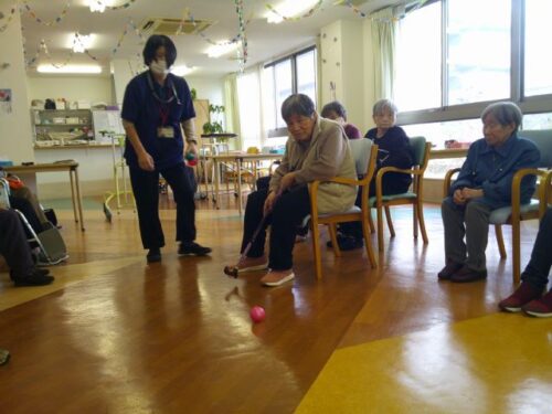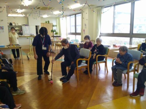 パターでボールを打つという単純なゲームですが、入居者様も職員も盛り上がり、