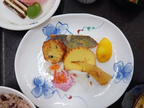 伊達巻き・鮭の西京焼き・烏賊松笠 黄金焼き・数の子・鶴蒲鉾・菊花蕪