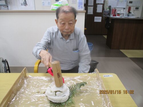 事前に希望者の方々におやつ前に集まっていただき木槌で鏡餅を叩きました。