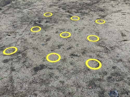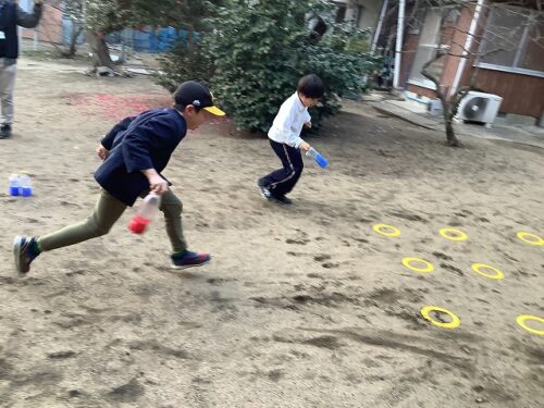 先頭の子どもがピンを置く→次の走者にタッチで交代→次の子どももピンを置く…。