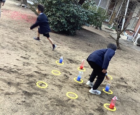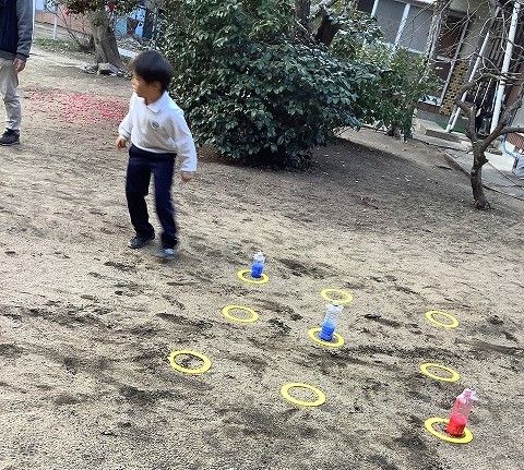 今回はペットボトルに色水を入れ、ピンに見立てて遊びました。