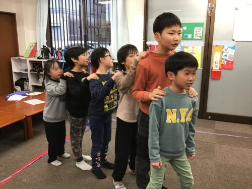 先頭のお友達が、相手チームの最後尾のお友達をタッチしたら勝ちというルールになりますが、