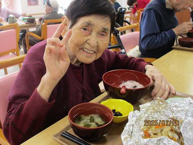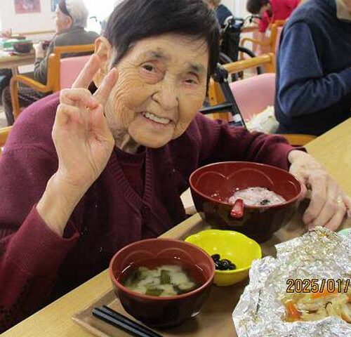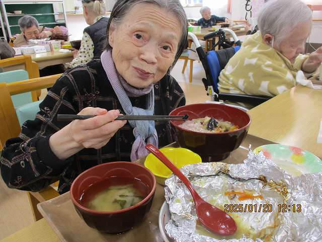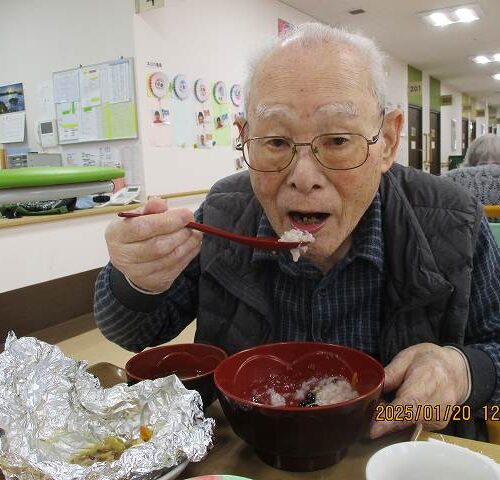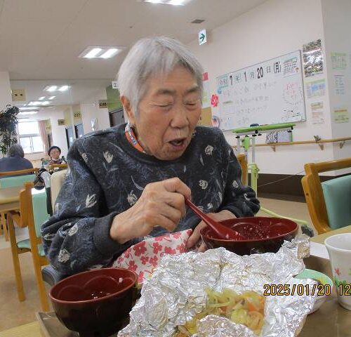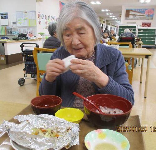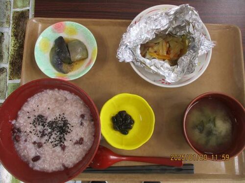 献立は「小豆がゆ」「鱈のホイル焼き」「なすの揚げ浸し」「煮豆」「味噌汁」でした。