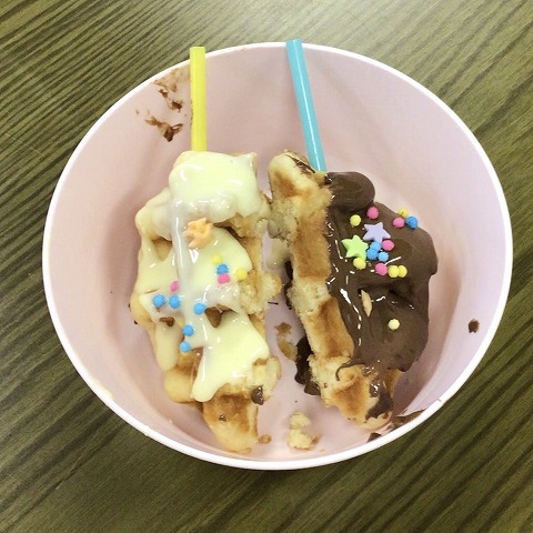 チョコとホワイトチョコのコントラストが良い感じですね😋皆「おいしい!」と笑顔で食べており、大成功のトッピングワッフルでした🎊