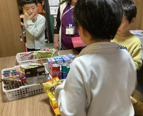 選び終わった後は、職員が店員役をしているレジのところまで向かいます。