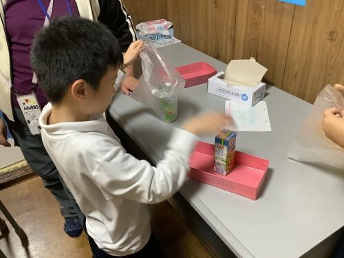 ⑤買ったお菓子を袋に詰める。