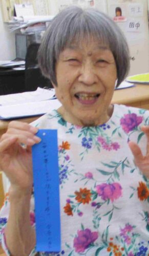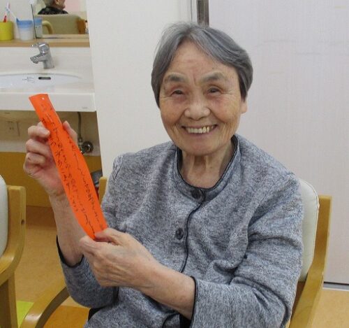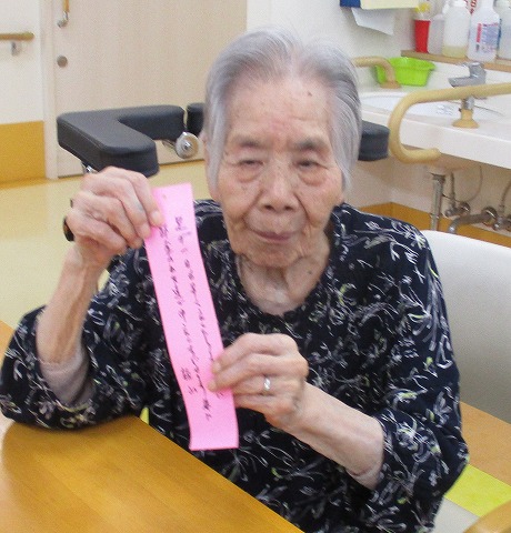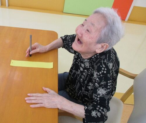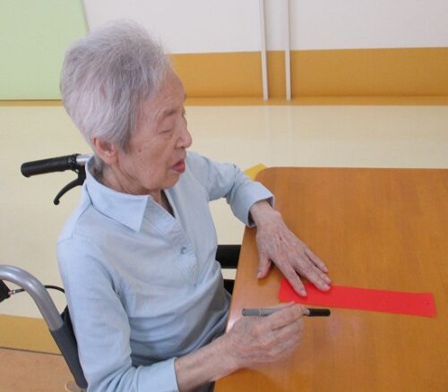 みんなであんた何を書く?などといいながらわいわい会議をしながら楽しそうに短冊を書いていただきました最初は何を書いていいか分からないと言われていましたが末松様がみんなの健康を願って書いてからは皆様とても軽快に筆が進んでいました