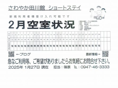ショートステイの空室状況 1月/2月 [さわやか田川館]