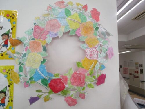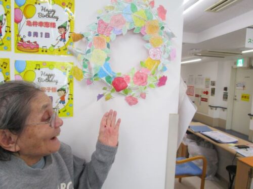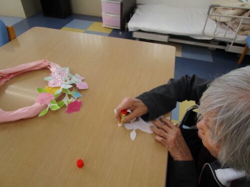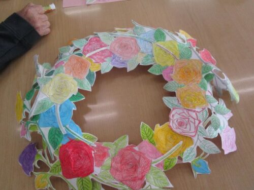 今回はこの前のレクで塗り絵をして頂いたものを切って