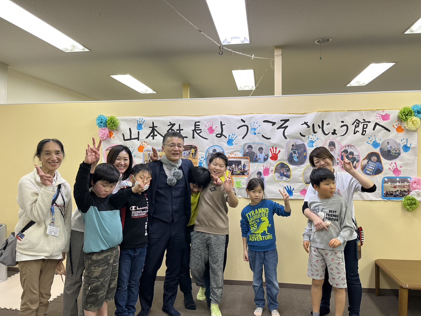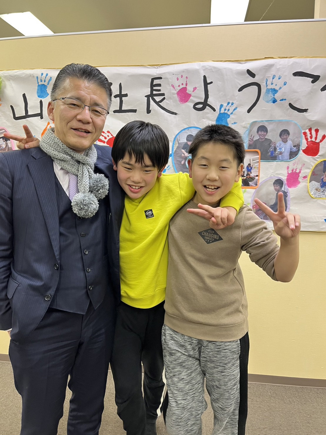 その際、子どもたちからサプライズがありました。それは、なんと手作りのマフラーのプレゼント!事前に子どもたちが一生懸命編み上げたもので、「社長、寒い日も元気でいてください!」と心を込めて贈られました。山本社長は感激し、「こんなに素敵なプレゼントをもらえて、とても嬉しいです。みんな、本当にありがとう!」と笑顔で受け取りました。