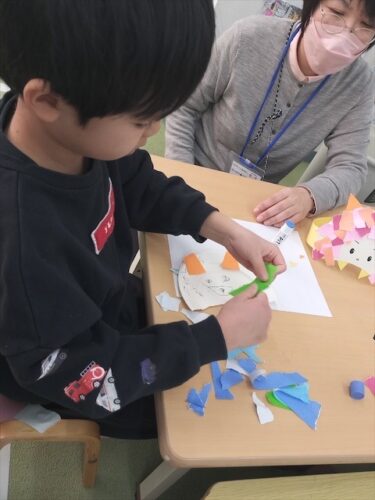 折り紙をちぎって髪の毛のように貼っていきます♪