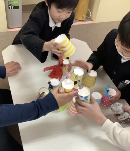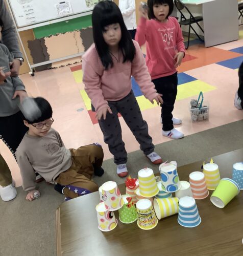 紙コップのオニをタワー状に積み上げて