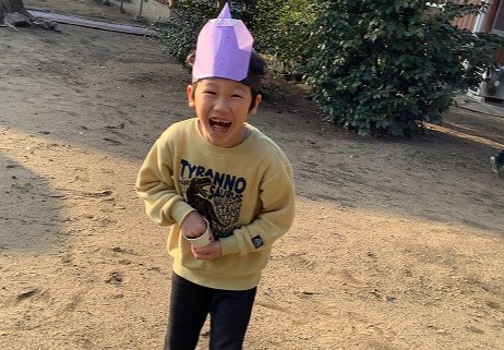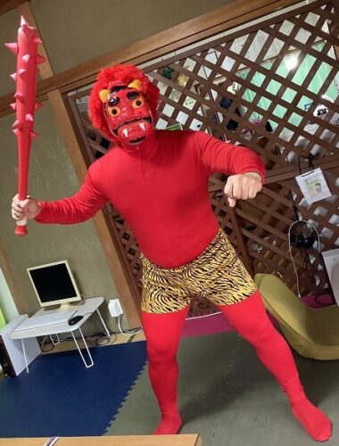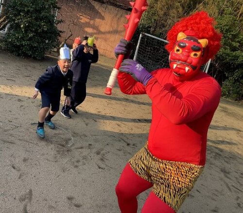 慌ててアフロをつけている鬼さんの周りで、子どもたちも大笑いです😖