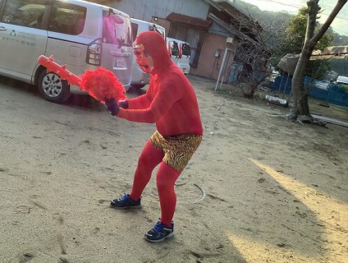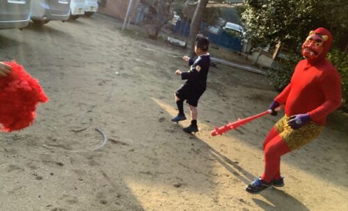 自分で作った鬼のお面をつけて、庭へとやってきました。