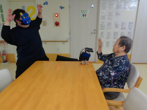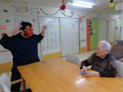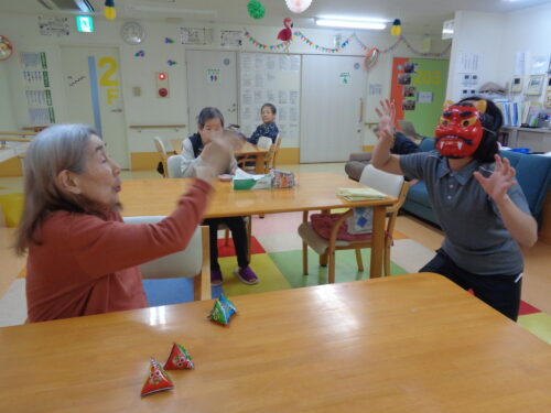 そんなわけで、早速スタッフが鬼に扮して豆まきをしました。