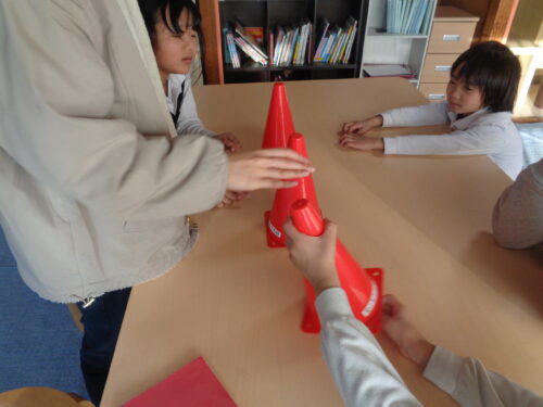 もう一つは、どのコーンにボールが入っているかな?