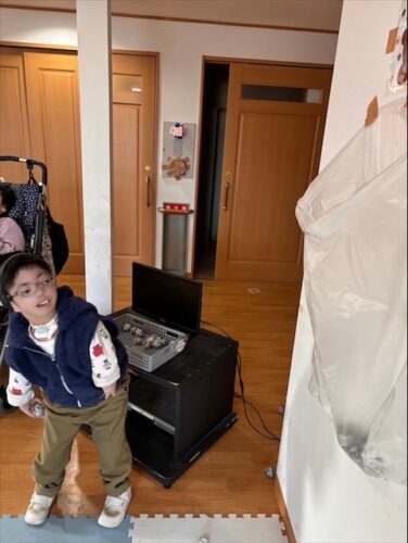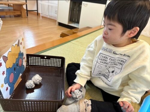 新聞紙を丸めたものを豆に見立てて鬼に向かって「鬼は外」と一生懸命投げました😊