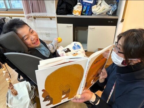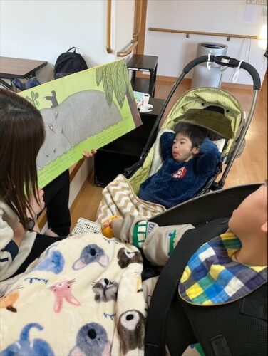 歌付きの絵本を見たり聞いたりしながら児童の表情もニコニコ☺️☺️