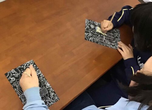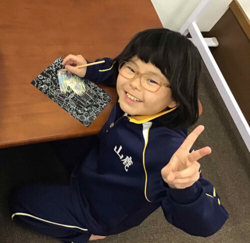 今、やまが館では女の子を中心にスクラッチアートがとても流行っています。やり方は極めて簡単で(写真参照)、割り箸の手で持つ方でただ削っていくだけ。そうすればいろいろな絵が現れてきます。大人でも結構楽しいですよ。